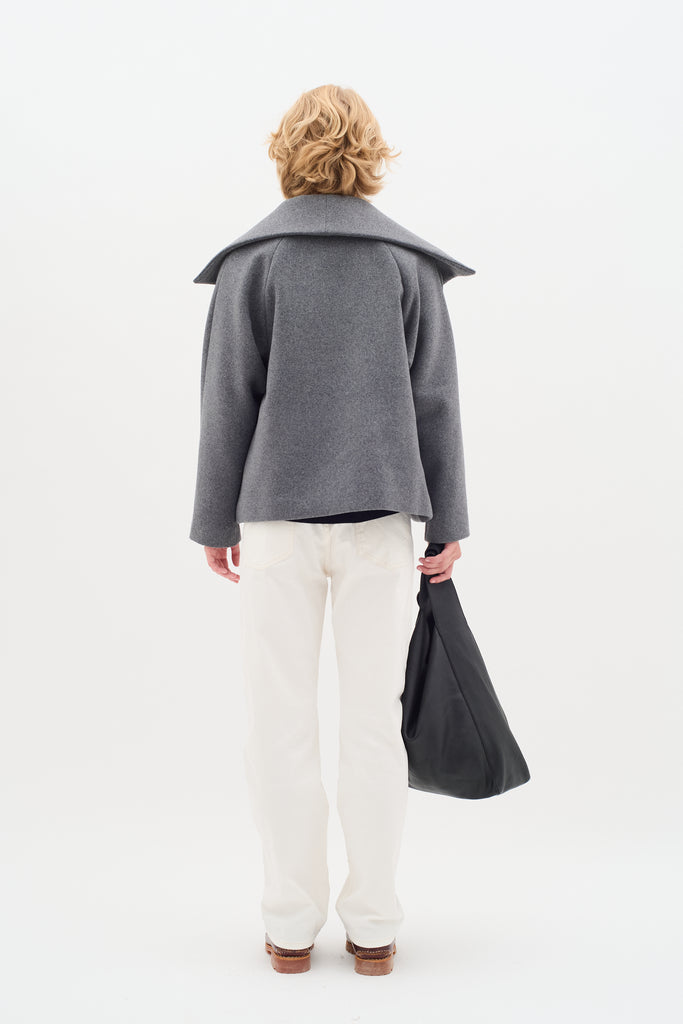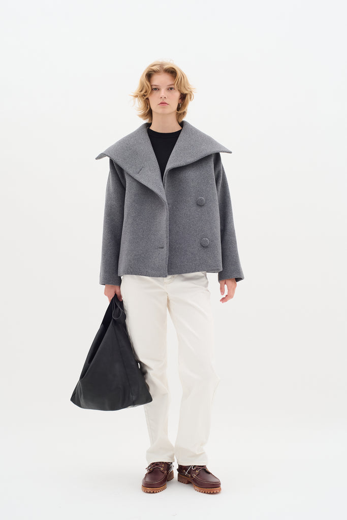 Grey wool coat with a large collar and button closure. The coat has a loose fit, creating an elegant and timeless look.