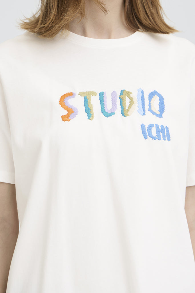 The IhRubby T-Shirt from Ichi is a versatile wardrobe essential that effortlessly elevates your everyday style. Crafted in soft, breathable white cotton, this classic tee features a striking colourful 'studio' graphic that adds personality and visual interest to any outfit. Perfect for layering or wearing solo, it's the kind of piece that works as hard as you do—whether you're heading to the studio, meeting friends, or simply embracing casual comfort. Invest in quality basics that make a statement.