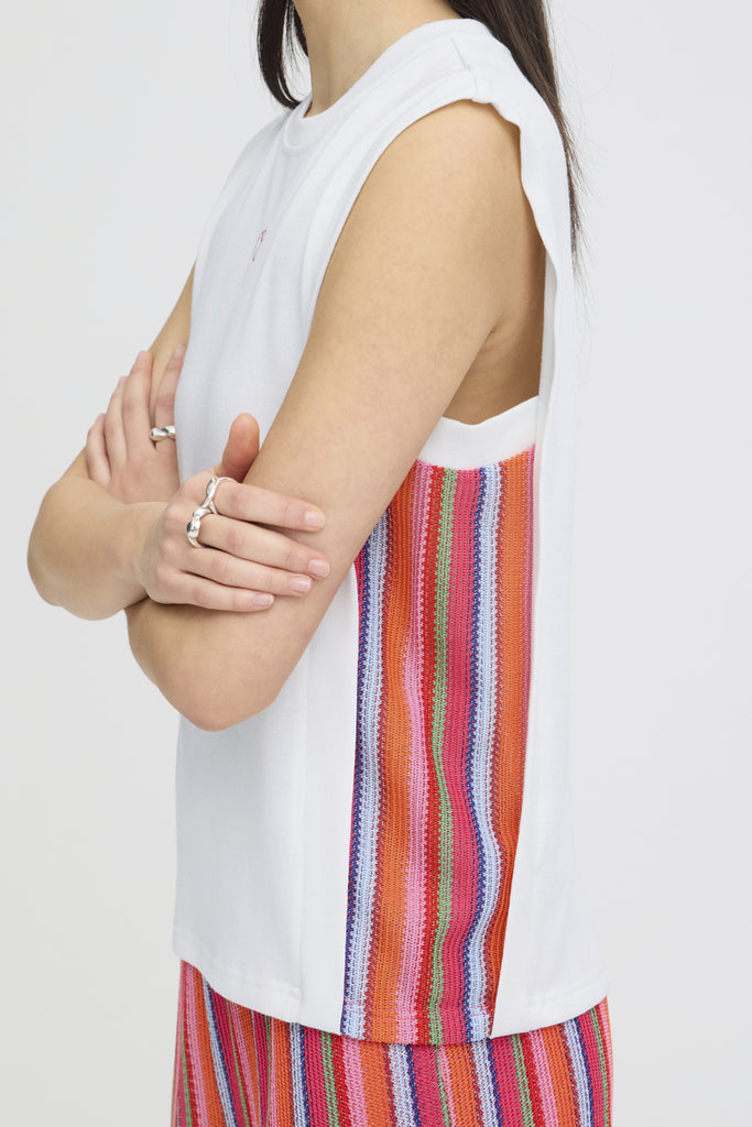 The IhLibella Top is a contemporary sleeveless design in soft Cloud Dancer fabric, elevated by vibrant striped detailing along the sides. This versatile piece effortlessly transitions from casual daywear to evening occasions, offering a modern silhouette with eye-catching colour blocking. Perfect for layering or wearing solo, it's a wardrobe essential from Ichi that combines comfort with distinctive style.