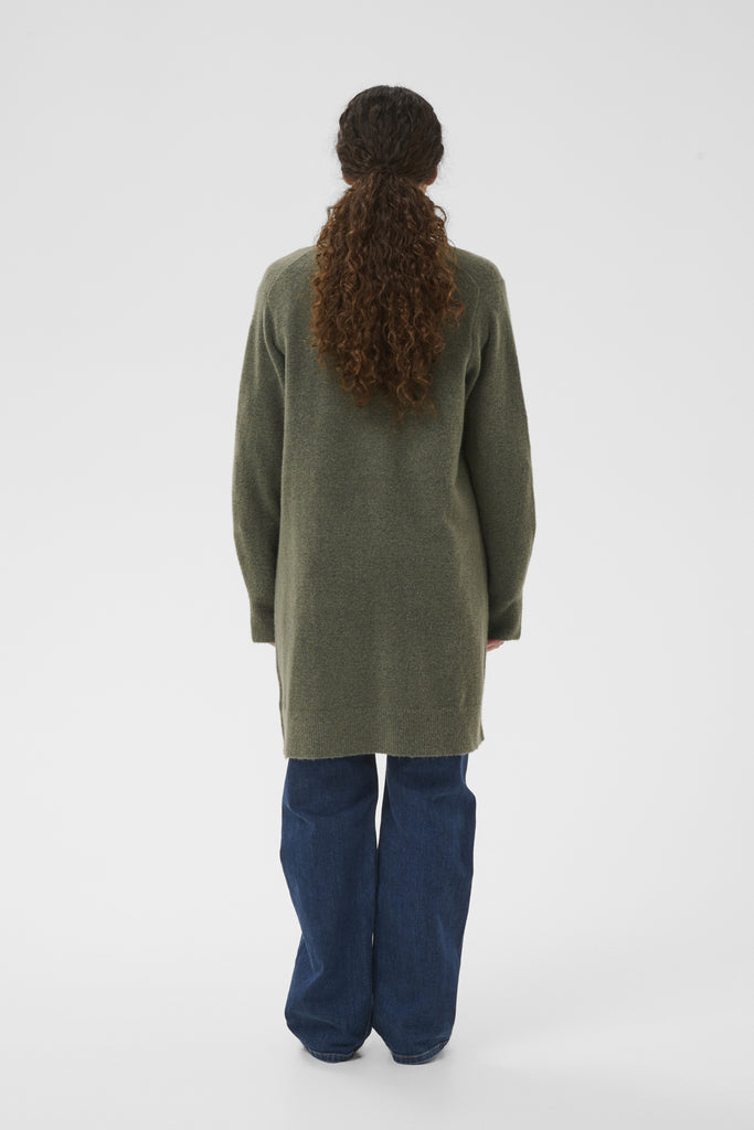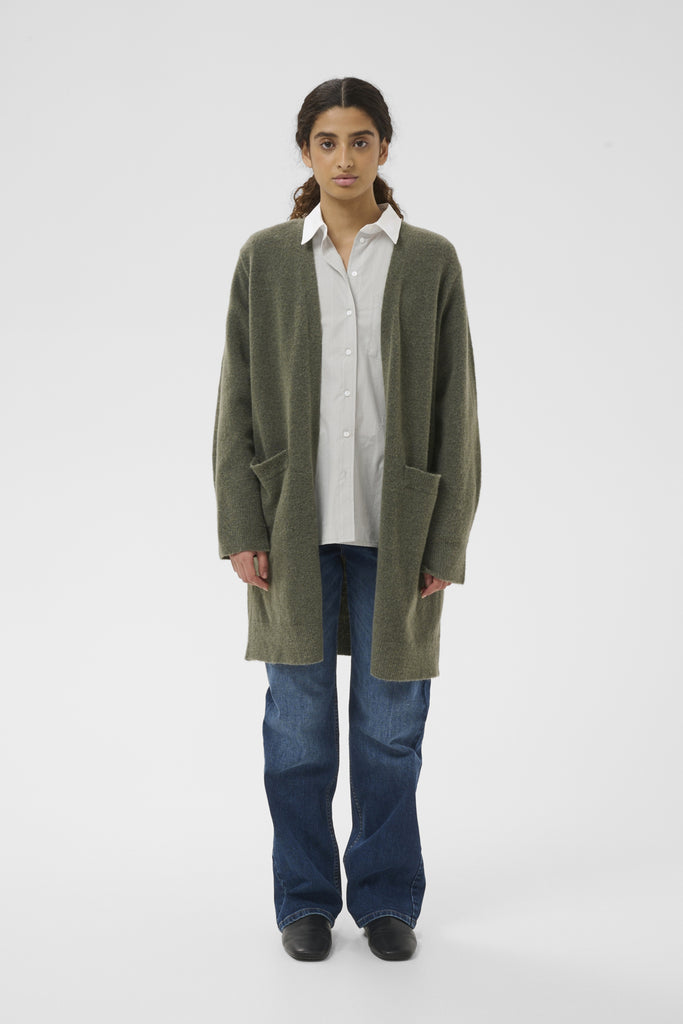 The GuniIW Cardigan in Mulled Basil from InWear is a sophisticated layering piece that effortlessly elevates any wardrobe. This long cardigan features a refined silhouette in a rich, muted sage-green tone that complements both neutral and patterned pieces. Perfect for transitional seasons, it works beautifully over dresses, knitwear, or casual basics. The extended length provides excellent coverage and a polished finish, making it ideal for creating relaxed yet put-together looks. A versatile essential that bridges the gap between comfort and style.
