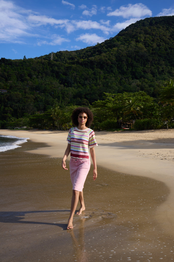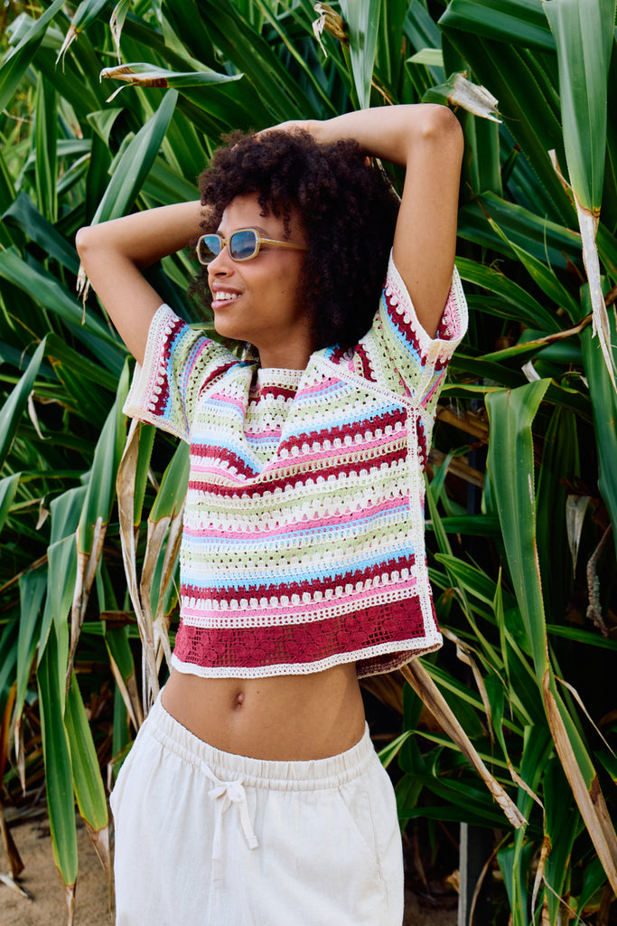 Brighten your wardrobe with this charming eyelet knit top from Ichi. Featuring vibrant horizontal stripes and delicate eyelet detailing, it's the perfect piece for effortless spring and summer styling. The relaxed short sleeves offer comfortable everyday wear, while the textured knit adds visual interest and dimension. Pair it with denim, linen trousers, or a flowing skirt for a fresh, versatile look that transitions seamlessly from casual outings to weekend gatherings.