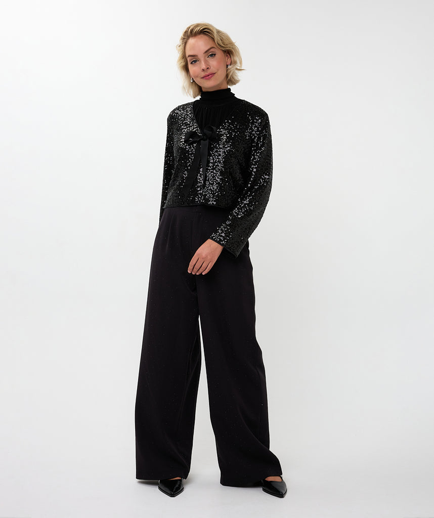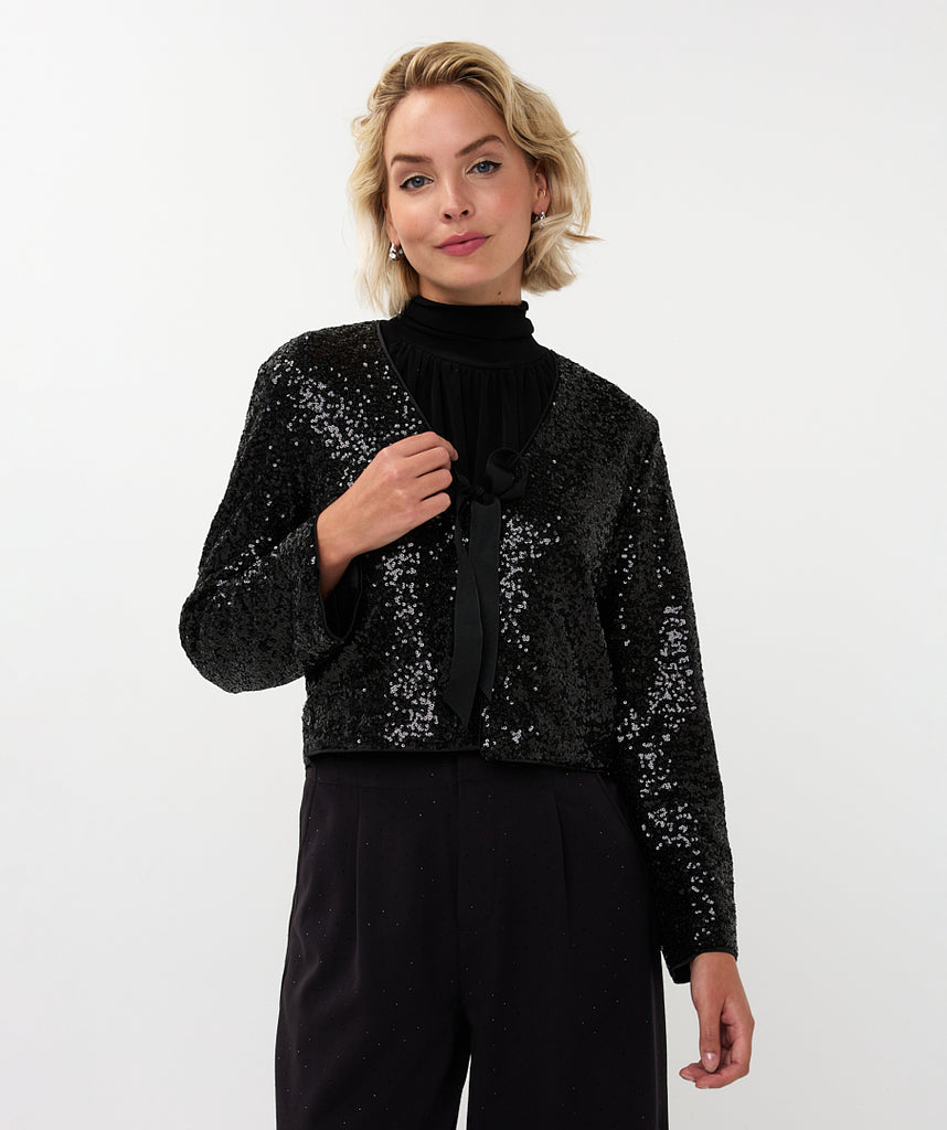 Elevate your evening look with the 08707 short Sequin Bow Blazer. Its shimmering sequins catch the light beautifully, while the front bow tie adds a flattering, feminine touch. Perfect for making a stylish statement at any event, this blazer combines glamour with a chic silhouette effortlessly.